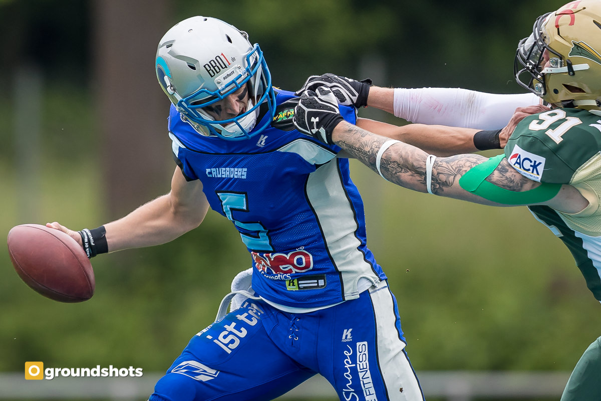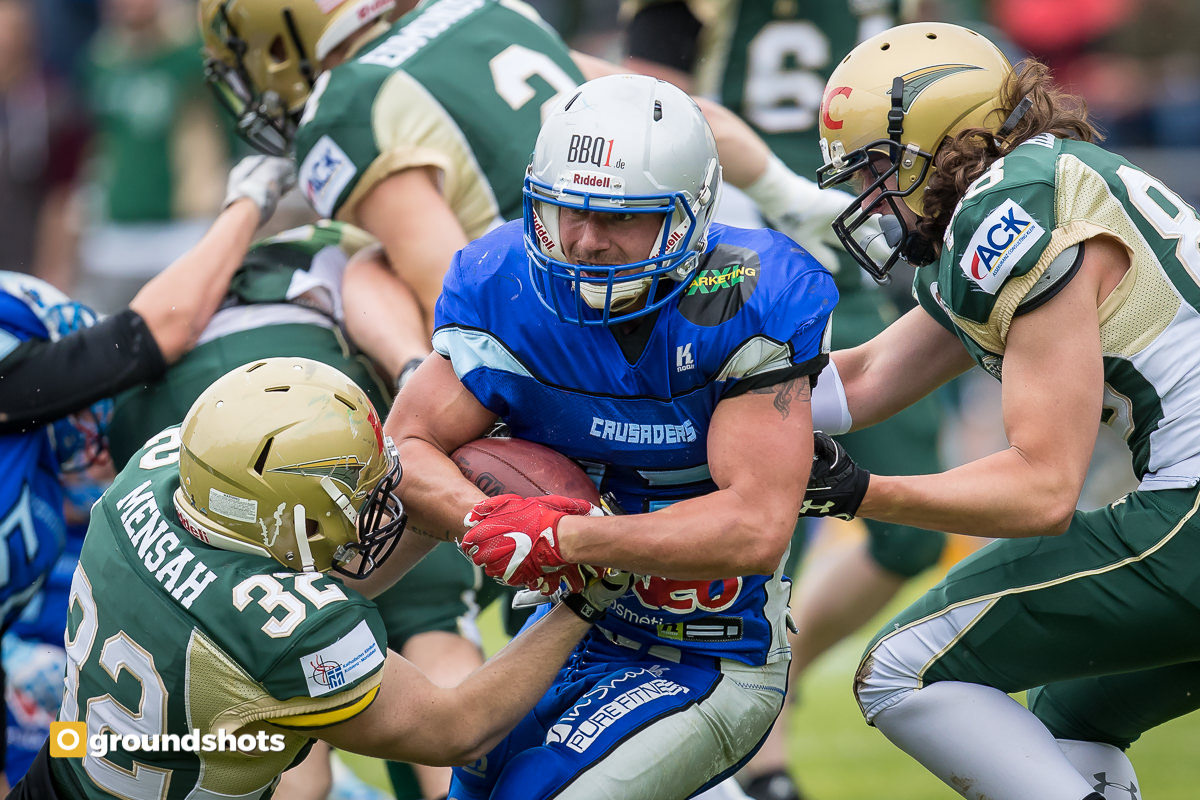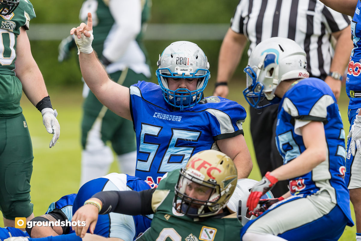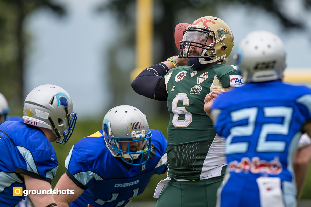 Einen Sahnetag hatten sowohl die Offense als auch die Defense der Albershausen Crusaders gegen die Fighting Farmers aus Montabaur erwischt. Die Abwehr erlaubte den Gästen kaum Raumgewinn und nur zwei Touchdowns, die eroberten Bälle setzte die Offensive konsequent in Punkte um.