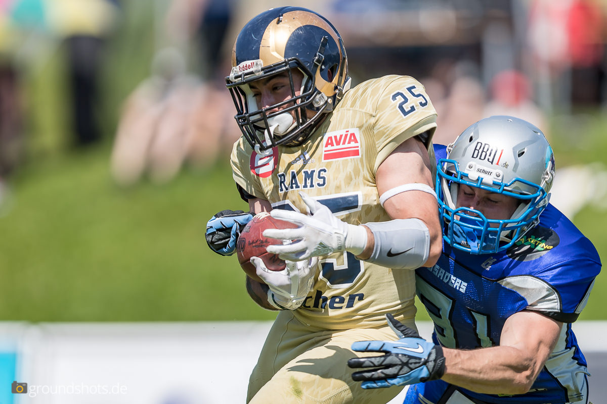 In der zweiten Hälfte übernahmen jedoch zunächst die Rams das Kommando – per Touchdown mit Two-Point-Conversion glichen sie aus und gingen nach einem weiteren Touchdown mit 14:21 in Führung. Die Cusaders glichen auf 21:21 aus jedoch legten die Nürnberger schnell wieder auf 21:28 vor. Dann die entscheidende Wendung. Die Crusaders egalisierten den Spielstand wieder und holten sich beim anschließenden Kickoff sofort den Ball zurück – der riskante Onside-Kick war gut gegangen. Und auch dieser Ballbesitz wurde wieder in Punkte verwandelt: 35:28 für Albershausen.