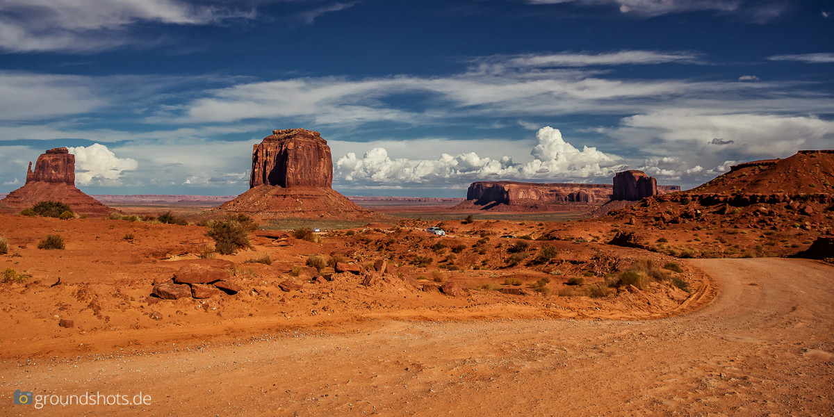 Glück hatten wir mit der Abfahrt. Ein Hauptgrund für die Auswahl eines SUV als Mietwagen war eben dieses Monument Valley. Die Zufahrt in das Tal wurde oft als gruslig beschrieben. Mannshohe Schlaglöcher und so weiter. Kurz vor unserer Ankunft schien die Abfahrt aber hergerichtet worden zu sein. Klar: es ist steil und sandig, also ein bißchen rutschig. Aber langsam fahrend locker machbar.